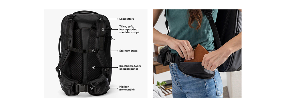 - Design specifico per i viaggi: Sistema di cintura toracica e sui fianchi regolabile, che fornisce un supporto robusto per un uso prolungato.