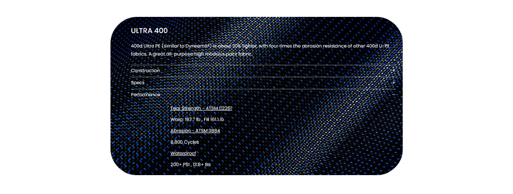 - Serie Aer Ultra: Il tessuto Ultra400X utilizzato nella serie Aer Ultra è realizzato in tessuto Ultra-PE 400D, una miscela di fibre di poliestere ad alta resistenza, laminato con Ultra-PE CrossPly. Il tessuto è supportato da uno strato di pellicola di 0,5 mil di spessore. La sua resistenza alla trazione è 15 volte superiore a quella dell'acciaio, rendendolo una delle fibre più resistenti oggi disponibili in commercio, con una densità estremamente bassa. Questo materiale composito è progettato per attrezzature outdoor leggere di fascia alta, offrendo una durata eccezionale pur mantenendo un peso minimo.