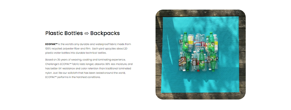 - Lo zaino da viaggio Tortuga Utilizza il tessuto impermeabile ECOPAK™ EPX200, un materiale ecocompatibile ad alte prestazioni sviluppato da Challenge Sailcloth. ECOPAK™ EPX200 è il primo tessuto composito al mondo realizzato con materiali riciclati al 100%. La sua struttura è composta da uno strato esterno in rPET 200D, uno strato di rinforzo CrossPly blu a 45°, una fodera antistrappo 70D e un supporto in pellicola riciclata RUV™. Questa struttura laminata, combinata con una resistenza all'acqua di oltre 200 PSI, garantisce la massima impermeabilità in caso di pioggia intensa. Il rinforzo CrossPly a 45° migliora significativamente la resistenza diagonale, riduce gli scarti di taglio e previene la distorsione del tessuto, rendendolo un materiale ideale per l'ottimizzazione dei viaggi.