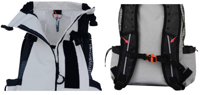 9. Sistema di protezione di sicurezza— Lo zaino è dotato di una fibbia di sicurezza anti-sganciamento, che può essere utilizzata insieme al collare del cane per garantire che quest'ultimo rimanga saldamente in posizione durante le frenate di emergenza. Le strisce riflettenti sono posizionate sugli spallacci (non coprono l'intera borsa) per evitare che la luce intensa interferisca con la concentrazione del conducente, garantendo al contempo la visibilità al traffico in arrivo.
