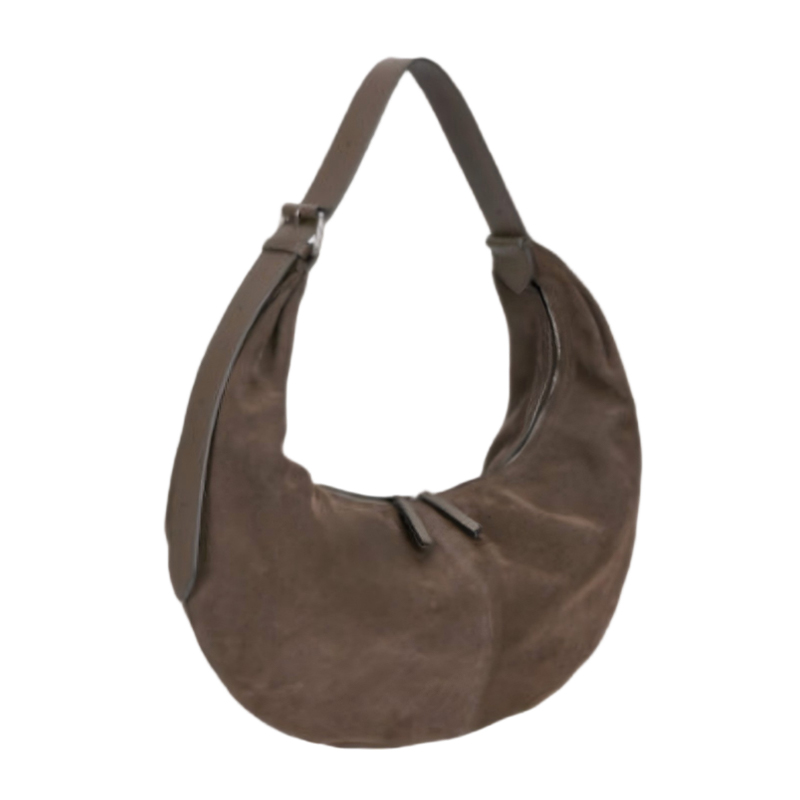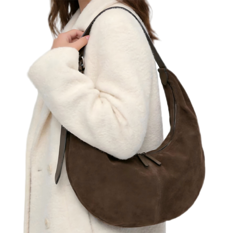 This brown suede hobo bag features a classic crescent shape with soft, rounded curves, giving it a natural, approachable feel. Ideal for creating a chic, sophisticated look, this handbag blends style with practicality, making it a timeless addition to any collection of women's handbags.