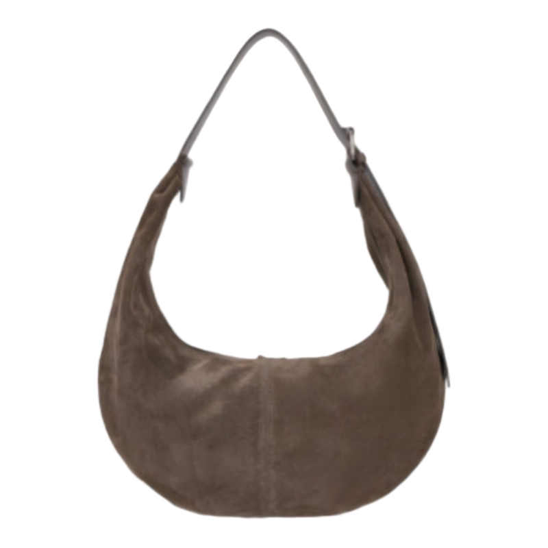 The suede shoulder bag features a leather strap and leather zipper pulls that elevate its premium look. This versatile hobo bag is perfect for a variety of occasions, offering the ideal balance of functionality and sophisticated design for any ladies bag collection.