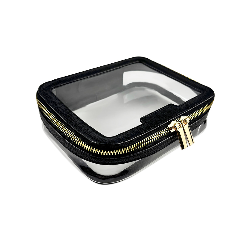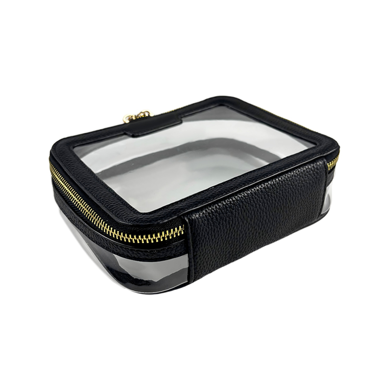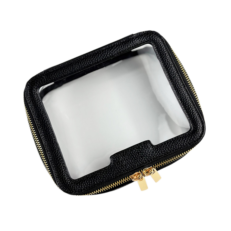 This timeless makeup bag features a classic black PU trim combined with high-quality transparent PVC, finished with a shiny gold metal zipper. Elegant and versatile, it is a go-to choice that appeals to a wide range of customers and fits effortlessly into any daily or travel routine.