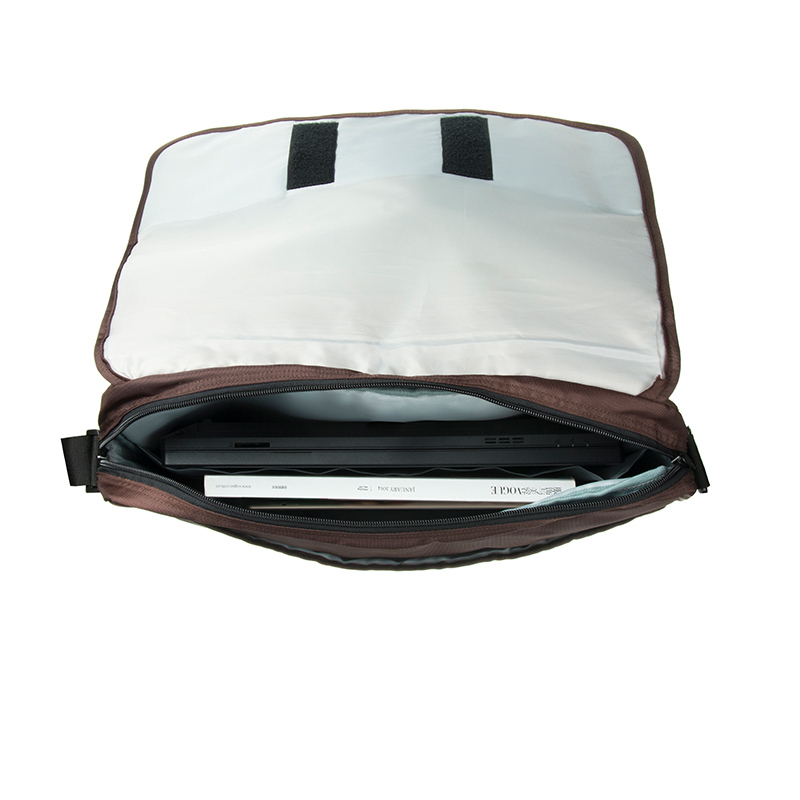 The interior structure is designed to meet the needs of a professional side bags for men category product. The first storage layer sits beneath the flap and is secured with two hook-and-loop fasteners, allowing users to conveniently store magazines, documents, or folders for quick access. The second and main compartment offers generous space and can comfortably hold laptops up to 16.5 inches. The interior is lined with PVC-padded cushioning, providing reliable protection for electronic devices during daily transport.