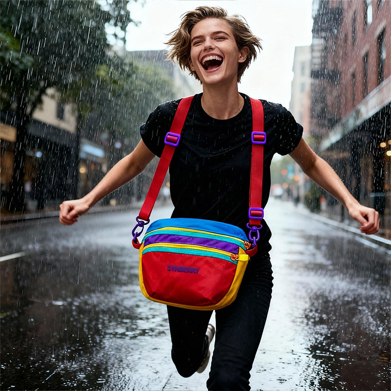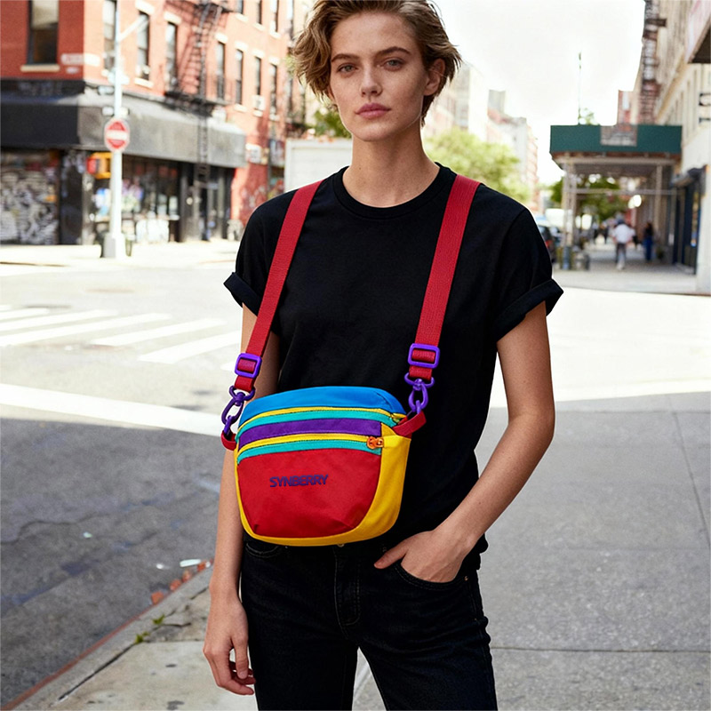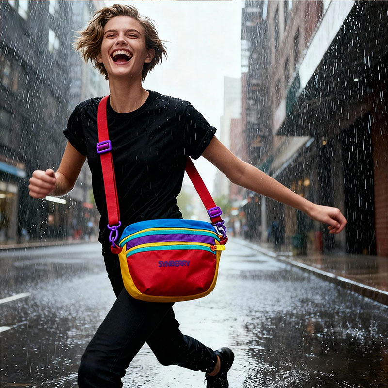 Engineered for fashion retailers and lifestyle brands, this lightweight waterproof nylon sling bag features vibrant dopamine colors for casual outings and modern street style versatility.